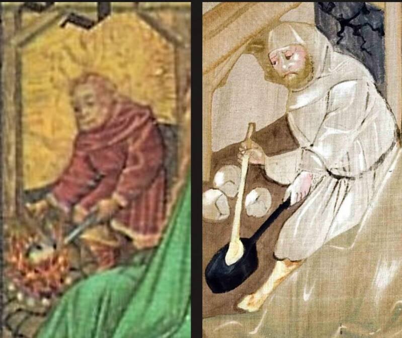 À gauche, Joseph est occupé à préparer un repas — un détail touchant qui met en valeur son rôle de père attentif, étonnamment moderne :