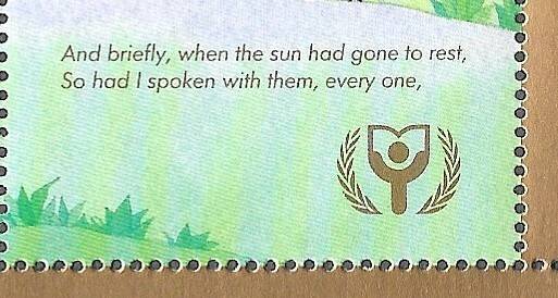 L'année 1990 a été désignée « Année internationale de l'alphabétisation » par les Nations Unies. On remarque sur la lisière du haut le symbole du Programme des Nations Unies pour le développement (PNUD) ; il figure également sur un timbre sur lequel on retrouve également deux vers extraits d'un poème célèbre de la littérature anglaise :